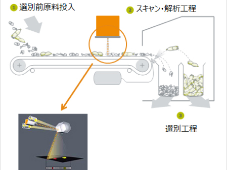 センサーにより材質の特徴を認識し、色を識別することによって混合廃棄物から幅広く資源を回収することが可能。